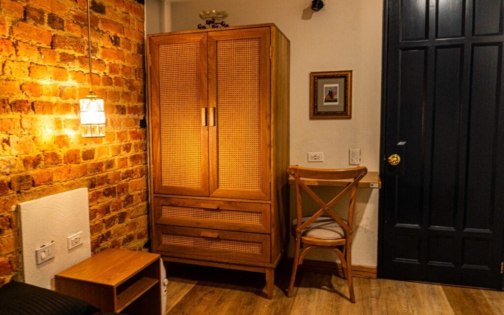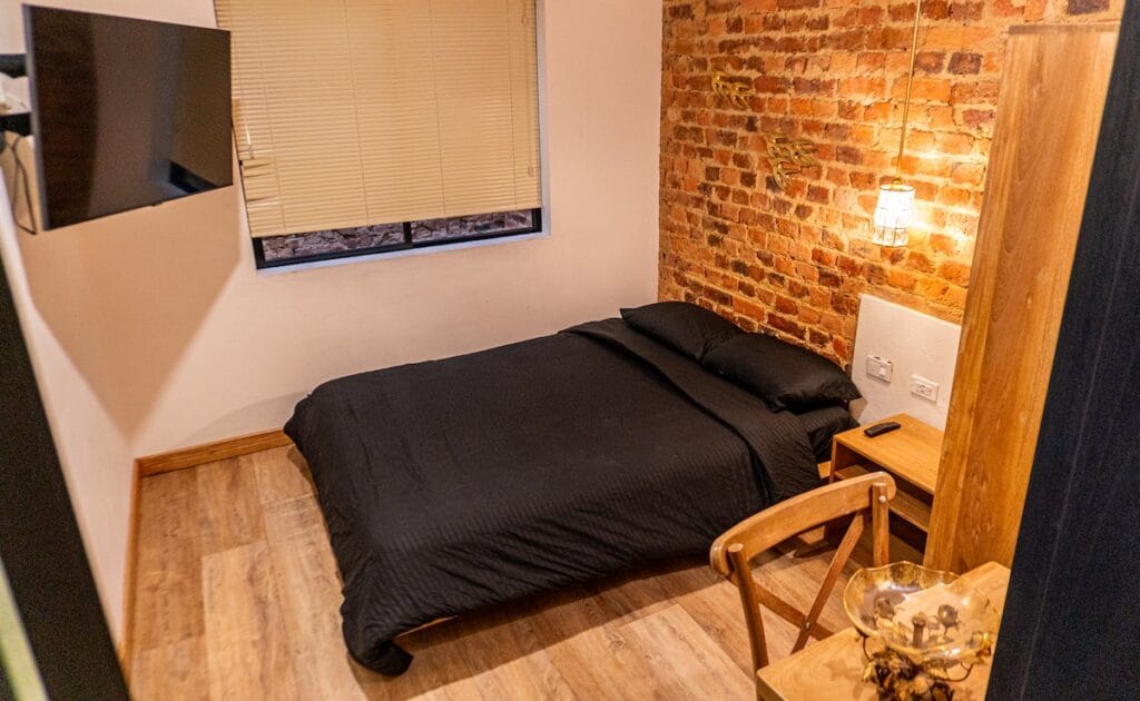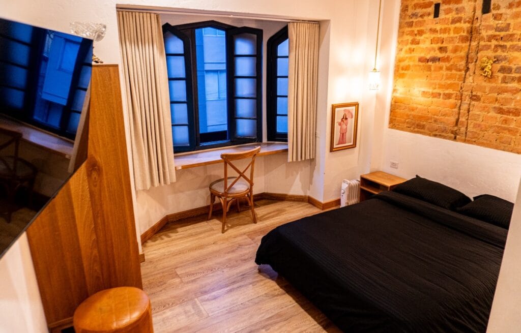 Entendemos que, después de un largo día recorriendo museos, iglesias y calles empedradas, necesitas un santuario privado para reponer energías. Por eso, hemos cuidado cada pequeño detalle, desde la suave iluminación hasta la excelente acústica, para garantizar que tu experiencia en nuestro hotel boutique bogotá sea totalmente inolvidable y profundamente reparadora. La habitación está equipada con una confortable cama doble de 140cm x 190cm, asegurando noches de descanso profundo.